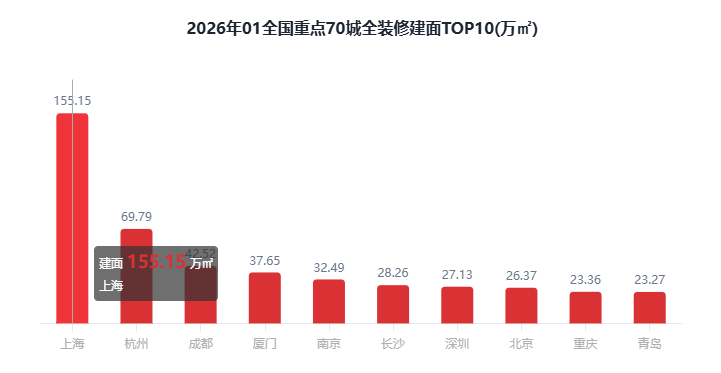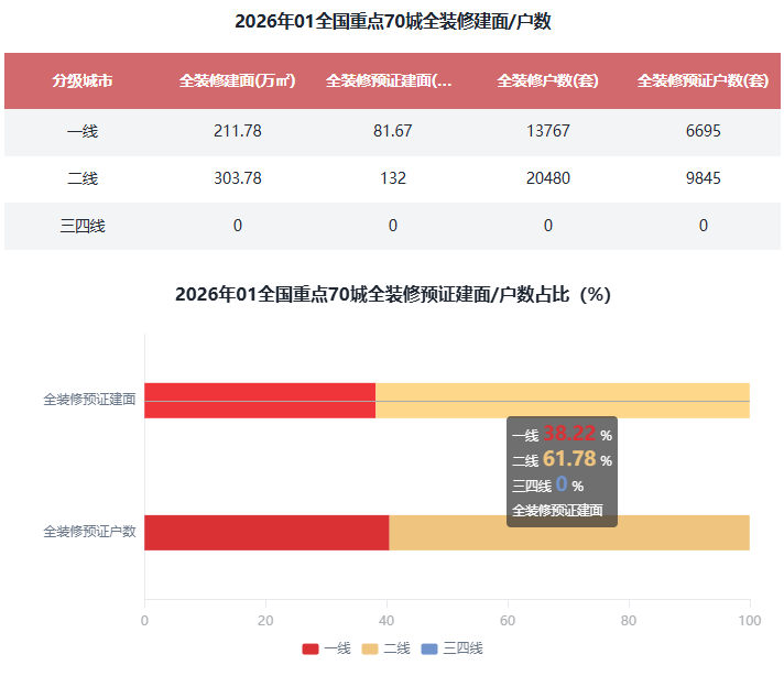 正在全国沉点70城全拆建筑面比例方面,对比全拆建筑面正在各分级城市的分布来看,二线万㎡,全拆修预证建面213.66万㎡,全拆修预证户数1.65万套,正在全国沉点70城全拆建筑面规模方面!全拆建筑面排正在前3位的城市别离为上海155.15万㎡、杭州69.79万㎡、成都42.52万㎡;2026年1月全国沉点70城新开盘建建面积2165.94万㎡,全拆建筑面比例排正在前3位的城市别离为南京100%、南通100%、深圳75.79%。此中,全拆修比例TOP10城市有8席是二线%。