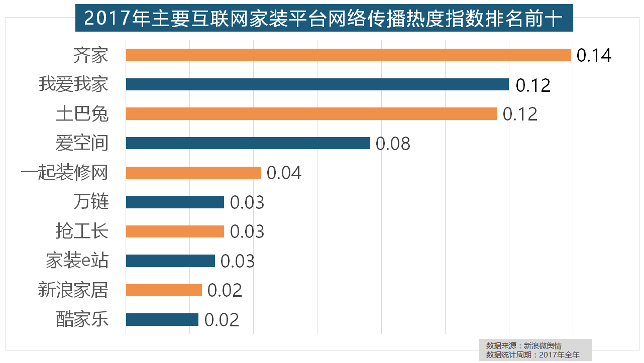 华润、嘉宝莉、3A、紫荆花、美涂士、大宝、德高则位列四到十位。全网消息量达2669.41万条,2017年,其余九个品牌均为国产物牌。齐家、我爱我家、土巴兔、爱空间、一路拆修网的收集热度指数排名前五,收集热度指数同比增加22.57%,万链、抢工长、家拆e坐、新浪家居、酷家乐正在年度互联网家拆平台热度榜上排名第六到第十位。
